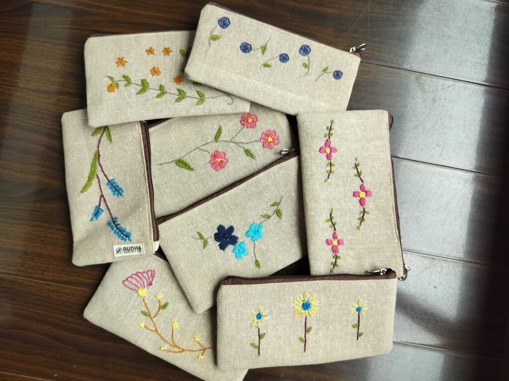 Rudhaa’s pouches are handmade, eco-friendly, and beautifully embroidered. They combine practicality with artisanal craftsmanship.